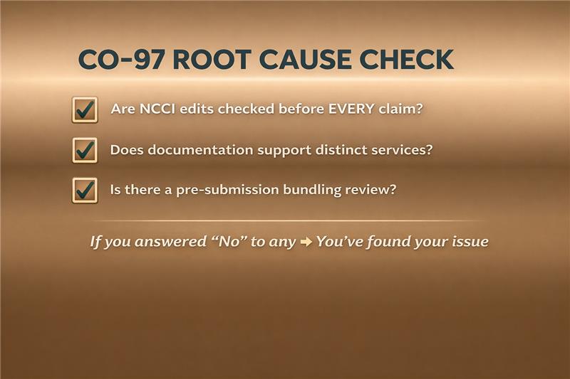 CO-97 happens because nobody checked the bundling rules before the claim went out. This isn’t a coding error. It’s a workflow gap.