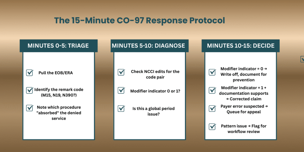 Most CO-97 denials can be triaged in 15 minutes.